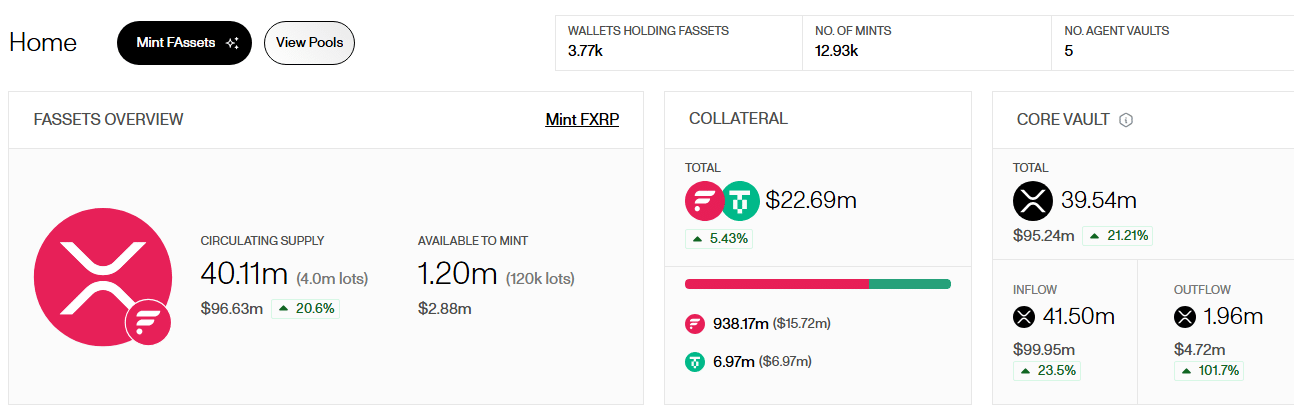 In keeping with the most recent information from Flare’s FAssets dashboard, roughly 39.54 million XRP ($98.54 million) is at present held in Flare’s vaults. Notably, customers have to this point minted 40.11 million FXRP, value $96.63 million. These tokens had been minted over 12,930 transactions. At the moment, the variety of particular person FXRP holders is 3,770.