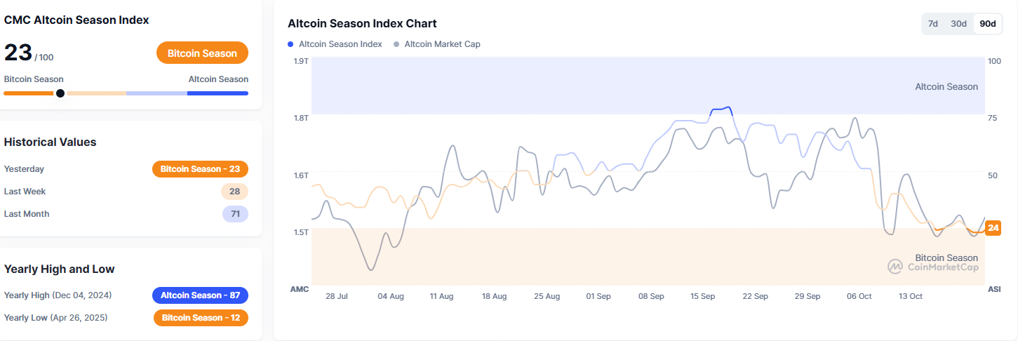 CoinMarketCap’s altcoin season indicator is at the moment at 23, which nonetheless signifies “Bitcoin season” till the gauge crosses the 75 degree.
