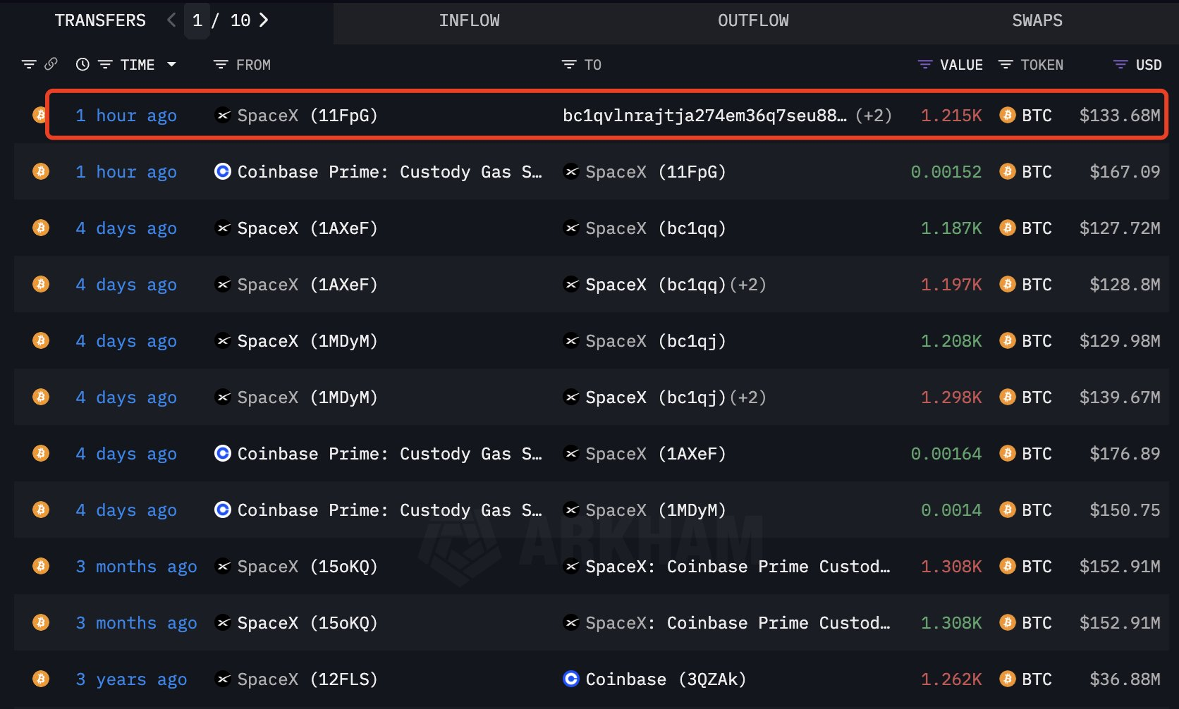 Elon Musk’s house exploration firm SpaceX at the moment transferred roughly $133.7 million (1,215 BTC) price of Bitcoin to 2 new wallets, marking the corporate’s second main Bitcoin transaction in three days.
